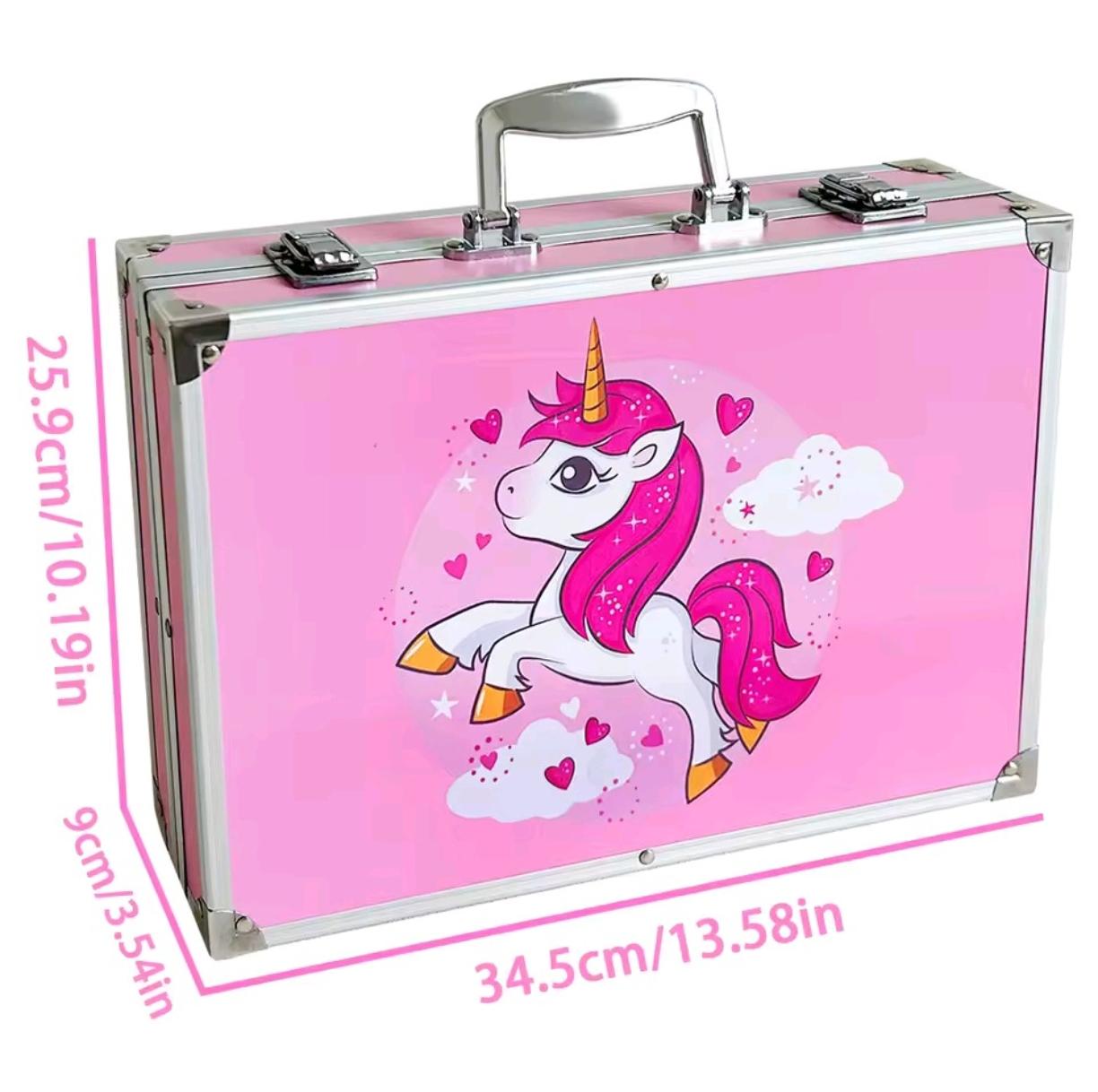 Diseño: Estética vibrante en color rosa con una ilustración central de un unicornio, corazones y nubes.